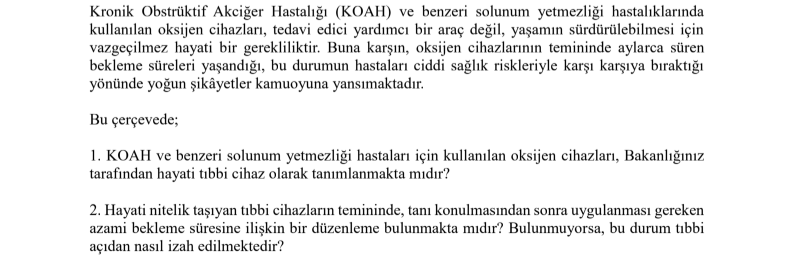CHP Eskişehir Milletvekili İbrahim Arslan, KOAH ve benzeri solunum yetmezliği hastalarının oksijen cihazlarına erişimde yaşadığı sorunları Türkiye Büyük Millet Meclisi gündemine taşıdı. Arslan, Sağlık Bakanı Kemal Memişoğlu ile Çalışma ve Sosyal Güvenlik Bakanı Vedat Işıkhan’ın yanıtlaması istemiyle yazılı soru önergeleri verdi. Önergelerde, aylarca süren bekleme sürelerinin hastalar açısından hayati riskler oluşturduğuna dikkat çekildi.