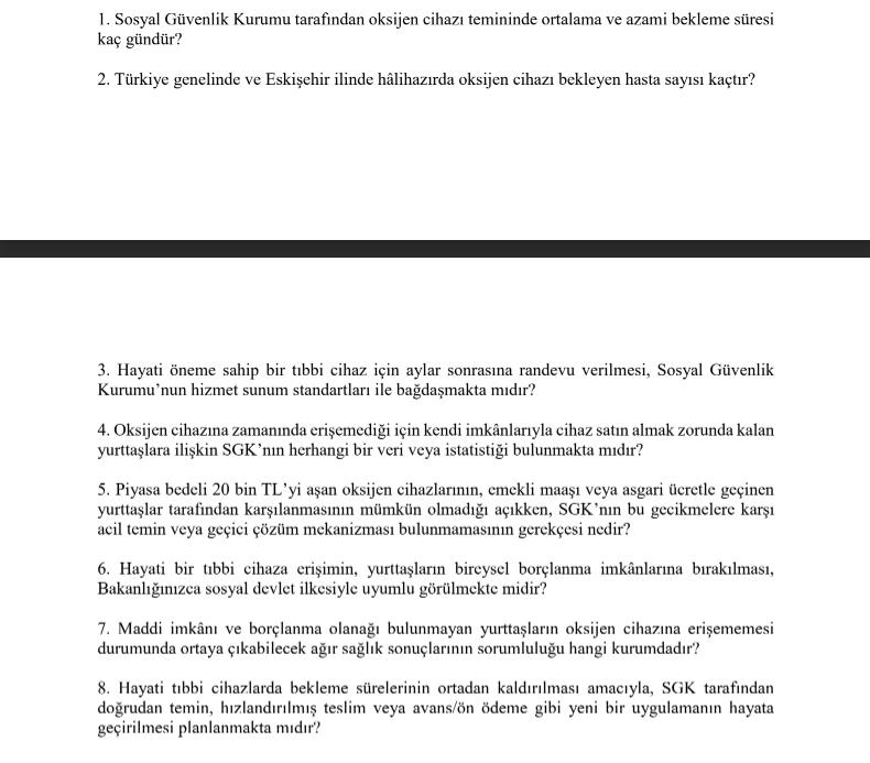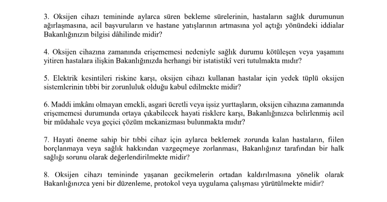 Arslan’ın sunduğu önergelerde, hayati öneme sahip oksijen cihazları için azami bir bekleme süresinin bulunup bulunmadığı soruldu. Ayrıca bu cihazlara zamanında erişemeyen hastalara ilişkin ölüm, acil başvuru ve hastane yatışı verilerinin tutulup tutulmadığı da gündeme getirildi. Elektrik kesintilerine karşı yedek tüplü oksijen sistemlerinin neden yaygınlaştırılmadığı da sorular arasında yer aldı.