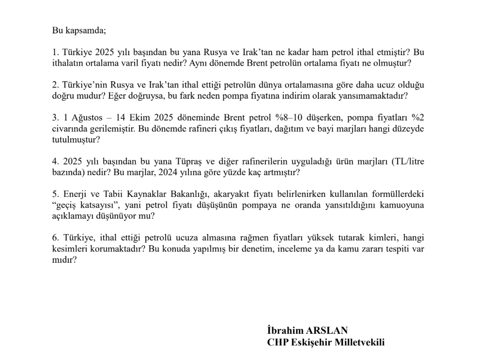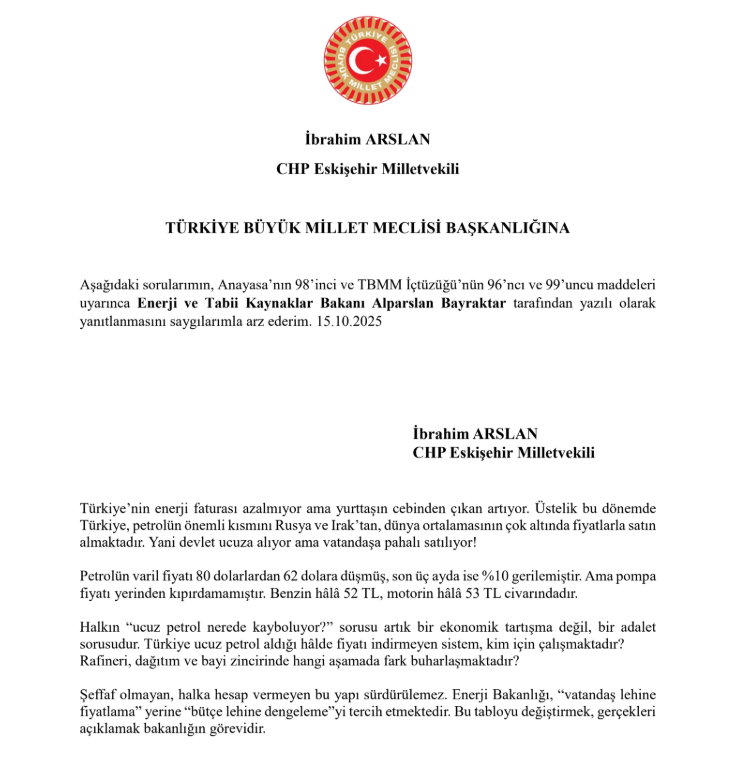 Arslan, hem Hazine ve Maliye Bakanı’na hem de Enerji ve Tabii Kaynaklar Bakanı’na iki ayrı soru önergesi vererek, “Petrol ucuzluyor ama vergi artıyor; pompada değişen tek şey fiyat tabelası!” dedi.