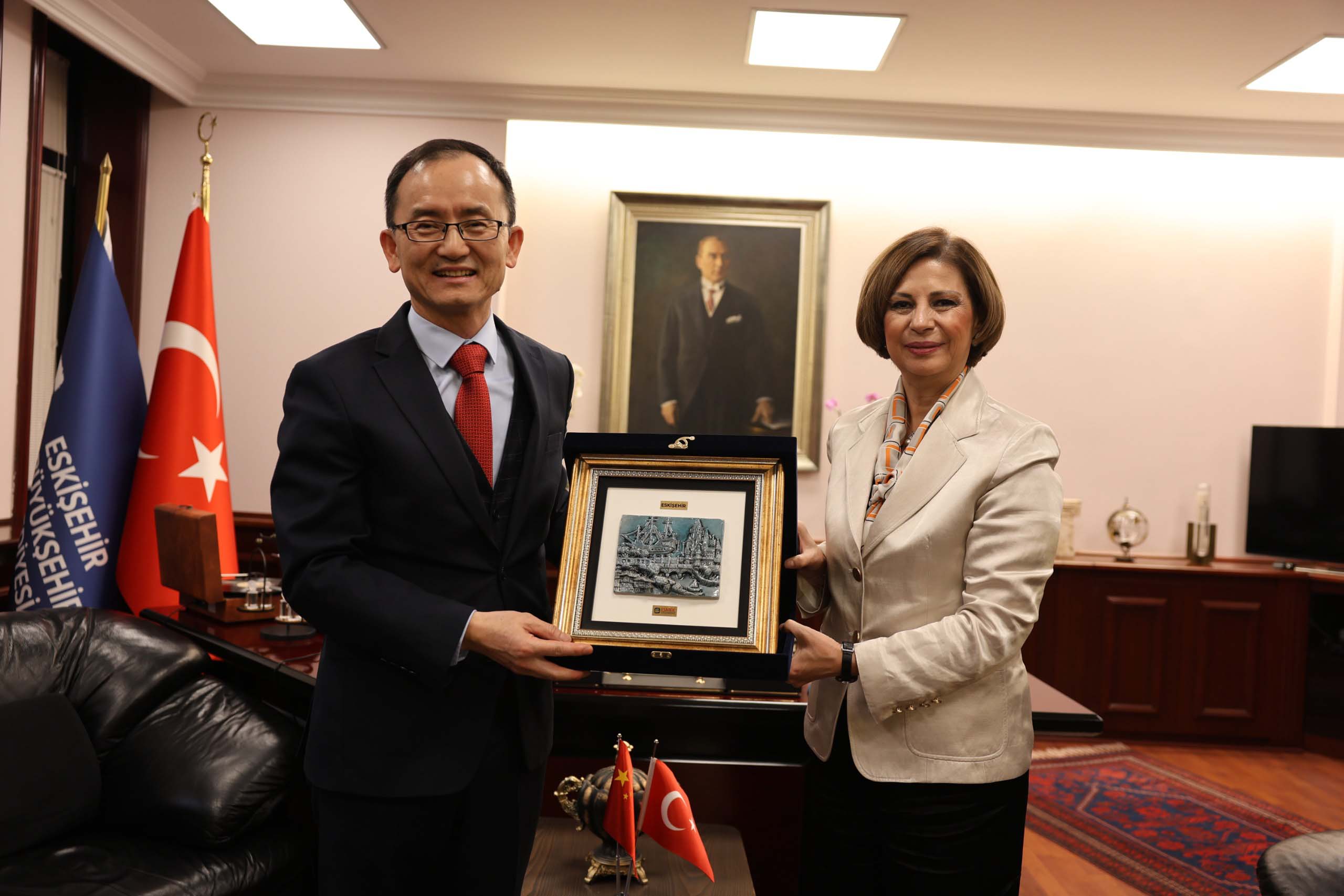Başkan Ünlüce daha sonra Çin Halk Cumhuriyeti Ankara Büyükelçisi Jiang Xuebin ve beraberindeki heyeti ağırladı. Eskişehir’de bulunmaktan mutluluk duyduğunu belirten Büyükelçi Jiang Xuebin, “Eskişehir’de kadın bir belediye başkanı ile bir araya gelmek son derece gurur verici. Kentiniz çağdaş ve gelişmiş bir şehir. Çalışmalarınızdan dolayı sizi tebrik ediyorum” dedi.