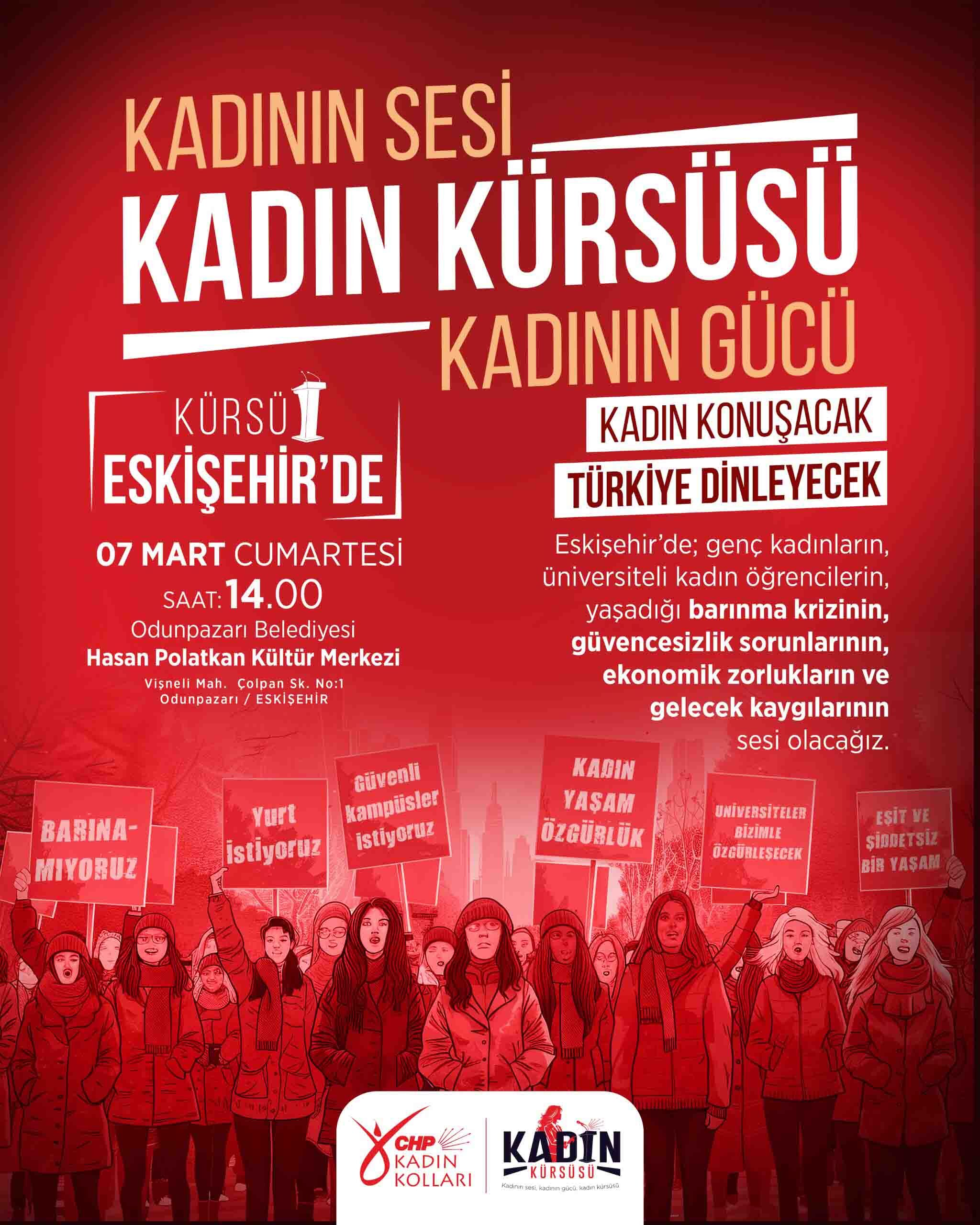 Kaya, programla ilgili yaptığı sosyal medya paylaşımında, “Kadın konuşacak, Türkiye dinleyecek. Kadın Kürsüsü’nün ilk durağı Eskişehir. Genç kadınların, üniversiteli öğrencilerin barınma krizine, güvencesizliğe ve gelecek kaygısına karşı söz şimdi kadınlarda. Bu kürsü kadınların, bu söz bizim” dedi.