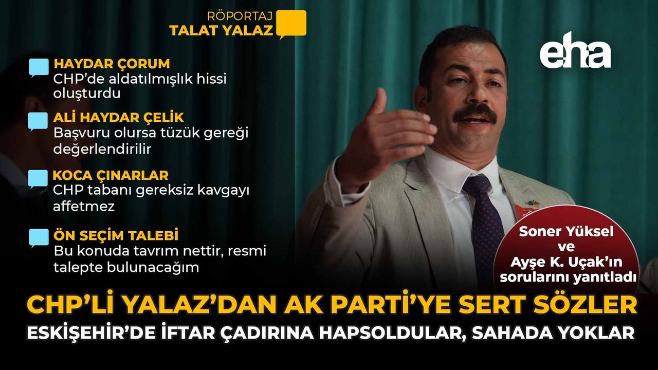 EHA ekranlarından AK Parti İl Başkanı Gürhan Albayrak’a canlı yayına birlikte çıkma çağrısında bulunan Yalaz, “Çıkalım canlı yayına, elimize evrakları alalım. Gürhan Bey ile açıkça konuşalım. O ne yapmış, ben onun ne yapmadığını; biz ne yapmışız, o bizim ne yapmadığımızı kamuoyu önünde tartışalım. Biz ne yaptığımızı biliyoruz. Bana böyle bir çağrı gelse, parti toplantılarına gidemem. Partililerim bana ‘AKP İl Başkanı’nın karşısına çıkmaya korkuyor musunuz’ diye sorar. Eğer karşıma çıkmaktan çekinmiyorsa, konuşacağımız konulardan çekiniyor demektir. Karşıma çıkmıyorsunuz, tartışamıyoruz. Bir iktidar partisinin il başkanı olarak pazarı gezsin, halkın içinde olsun. Hatta birlikte pazar gezelim. Kendisini şeffaf siyasete davet ediyorum. Gelin pazara çıkalım, Soner Yüksel’in moderatörlüğündesoruları birlikte yanıtlayalım. Biz şeffaf siyaset yapıyoruz. Kafamızın arkasında başka bir hesap yok. Bizim olmadığımız ortamlarda gerçekle ilgisi olmayan ithamlarla siyaset yapmak siyaset değildir” ifadelerini kullandı.