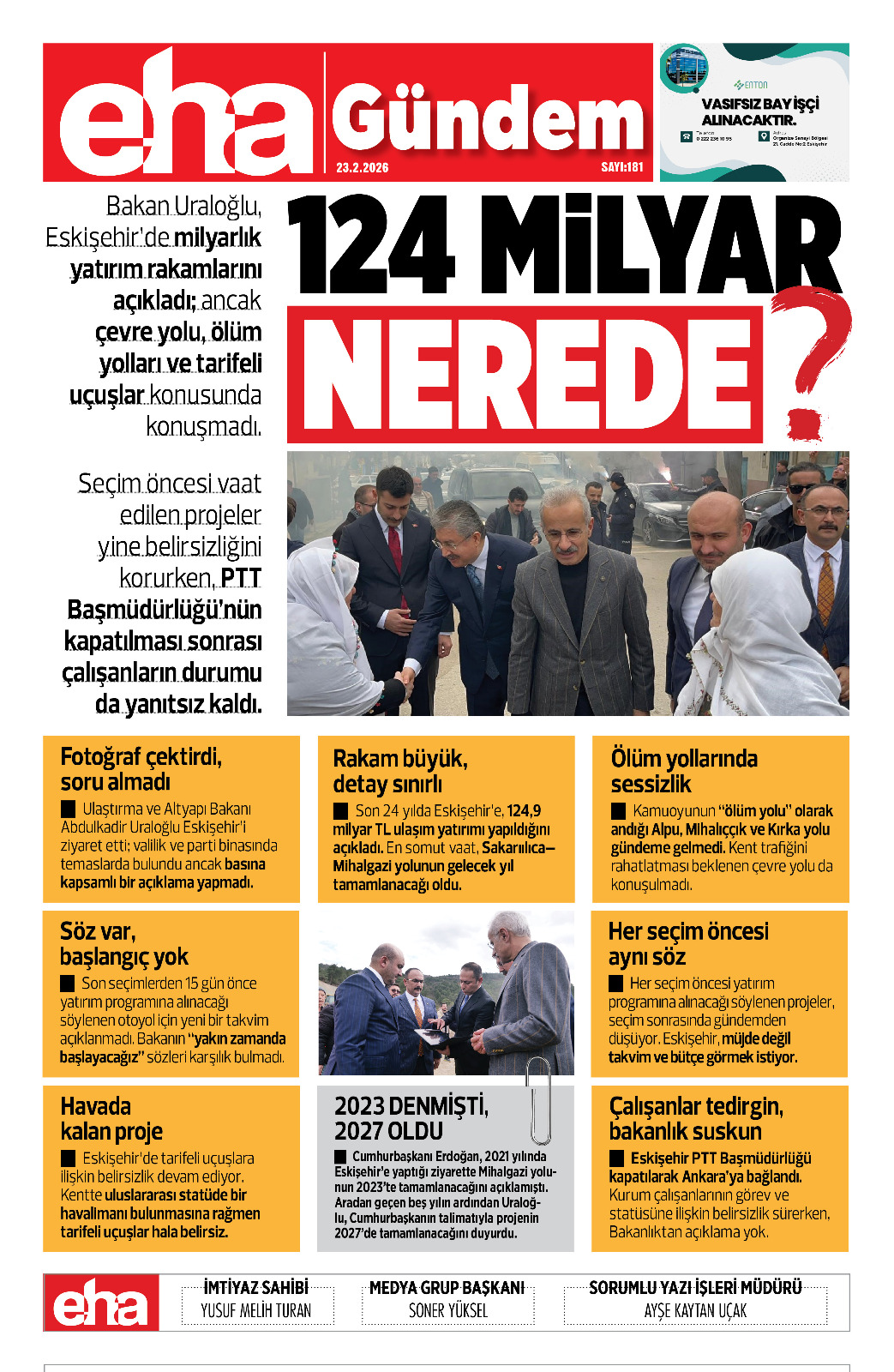 Ancak kamuoyunun “ölüm yolu” olarak andığı Alpu, Mihalıççık ve Kırka yolu gündeme gelmedi. Kent trafiğini rahatlatması beklenen çevre yolu da konuşulmadı.