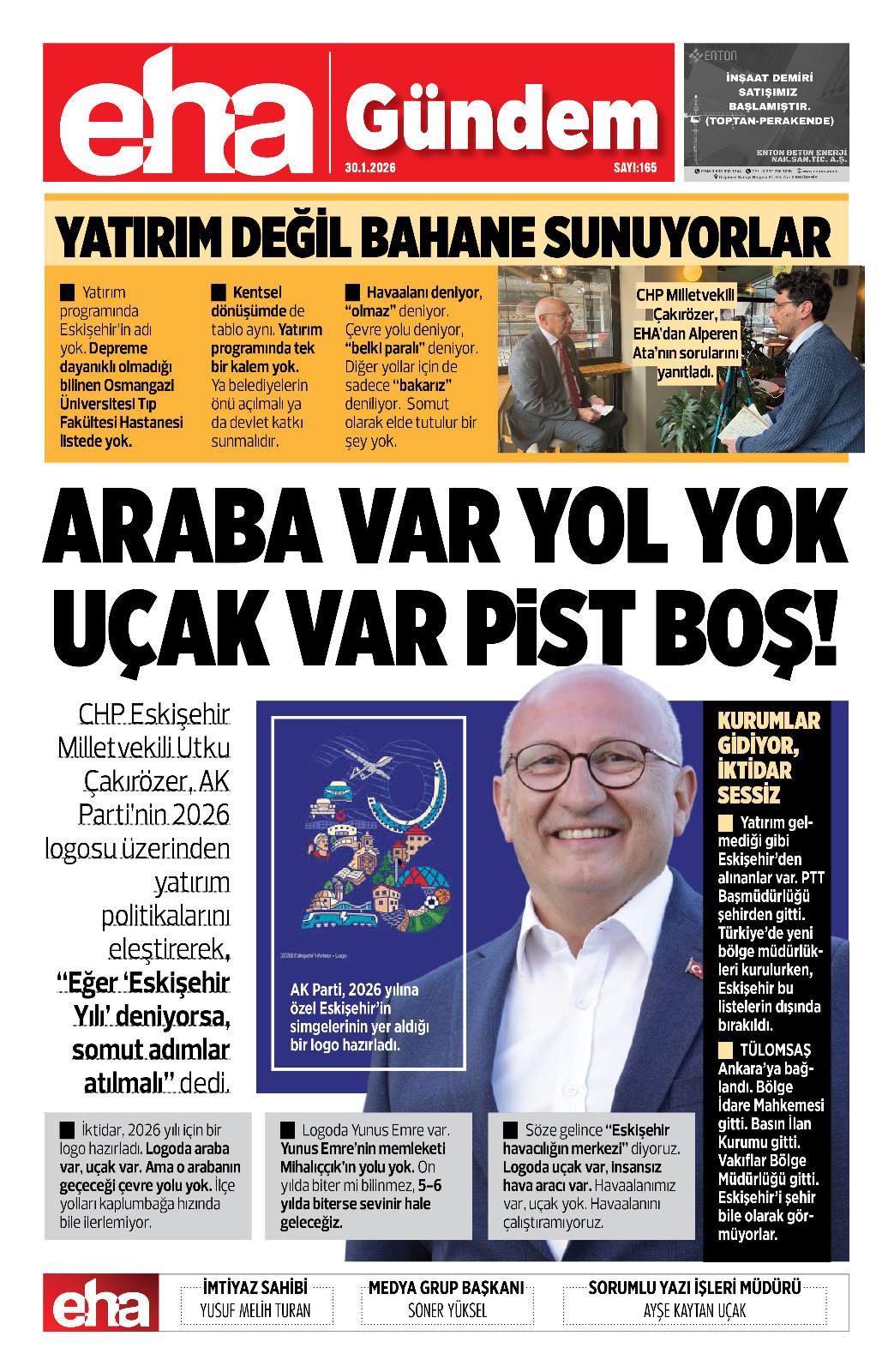 İktidar, 2026 yılı için bir logo hazırladı. Logoda araba var, uçak var. Ama o arabanın geçeceği çevre yolu yok. İlçe yolları kaplumbağa hızında bile ilerlemiyor.