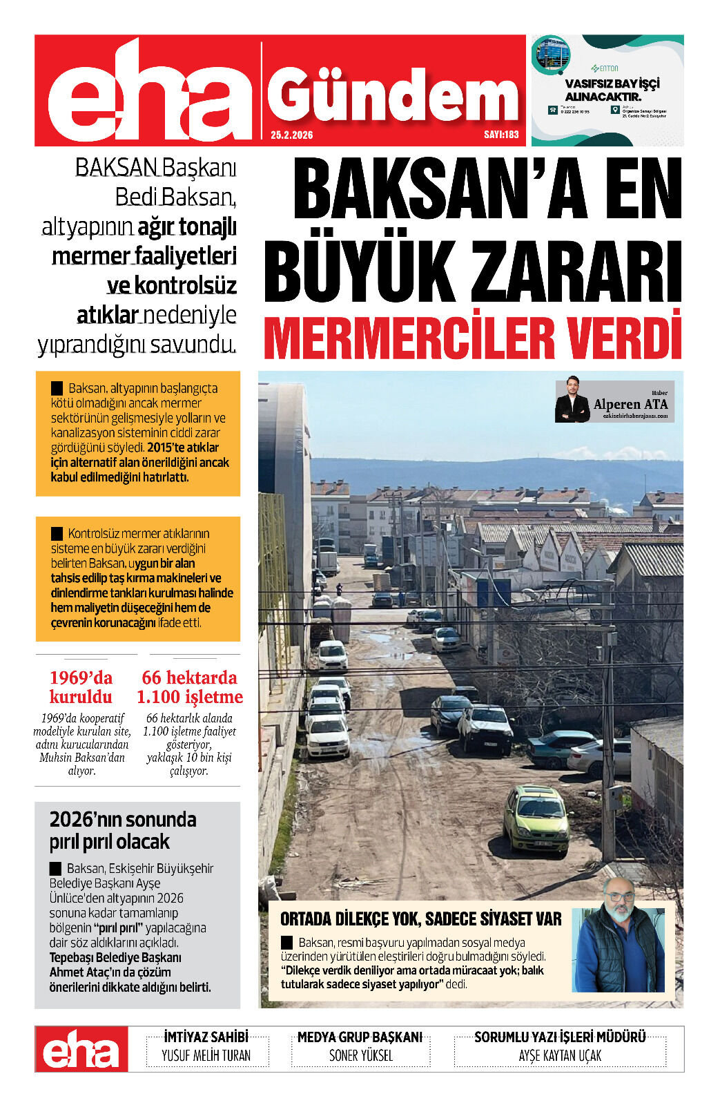 Baksan, altyapının başlangıçta kötü olmadığını ancak mermer sektörünün gelişmesiyle yolların ve kanalizasyon sisteminin ciddi zarar gördüğünü söyledi. 2015’te atıklar için alternatif alan önerildiğini ancak kabul edilmediğini hatırlattı.