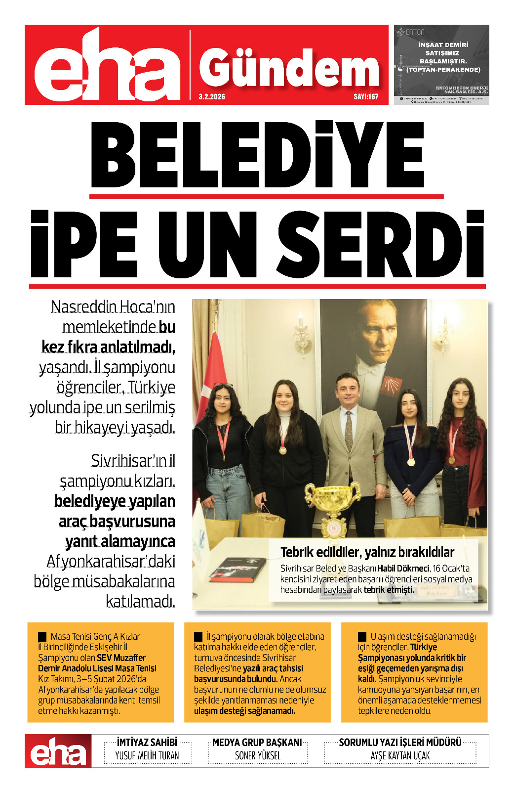 Masa Tenisi Genç A Kızlar İl Birinciliğinde Eskişehir İl Şampiyonu olan SEV Muzaffer Demir Anadolu Lisesi Masa Tenisi Kız Takımı, 3–5 Şubat 2026’da Afyonkarahisar’da yapılacak bölge grup müsabakalarında kenti temsil etme hakkı kazanmıştı.