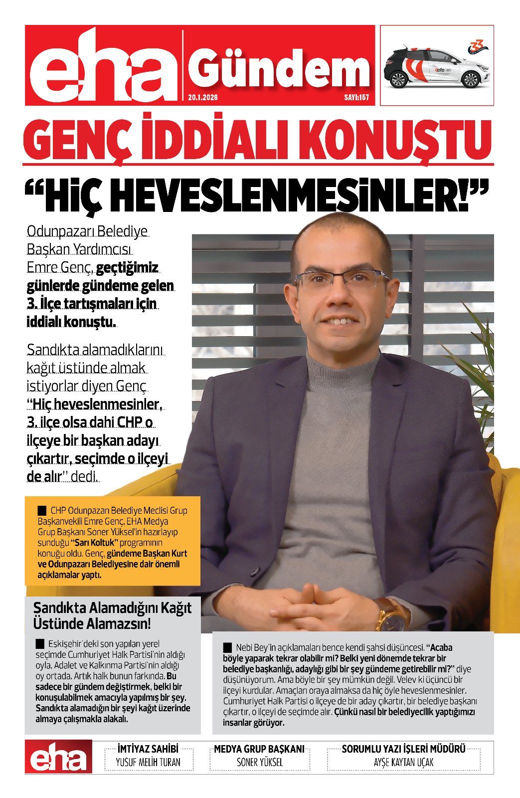 CHP Odunpazarı Belediye Meclisi Grup Başkanvekili Emre Genç, EHA Medya Grup Başkanı Soner Yüksel’in hazırlayıp sunduğu “Sarı Koltuk” programının konuğu oldu. Genç, gündeme Başkan Kurt ve Odunpazarı Belediyesine dair önemli açıklamalar yaptı.