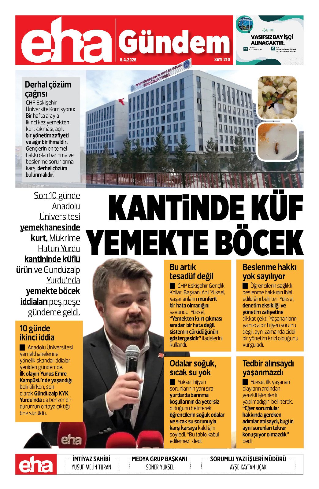 CHP Eskişehir Gençlik Kolları Başkanı Anıl Yüksel, yaşananların münferit bir hata olmadığını savundu. Yüksel, “Yemekten kurt çıkması sıradan bir hata değil, sistemin çürüdüğünün göstergesidir” ifadelerini kullandı.