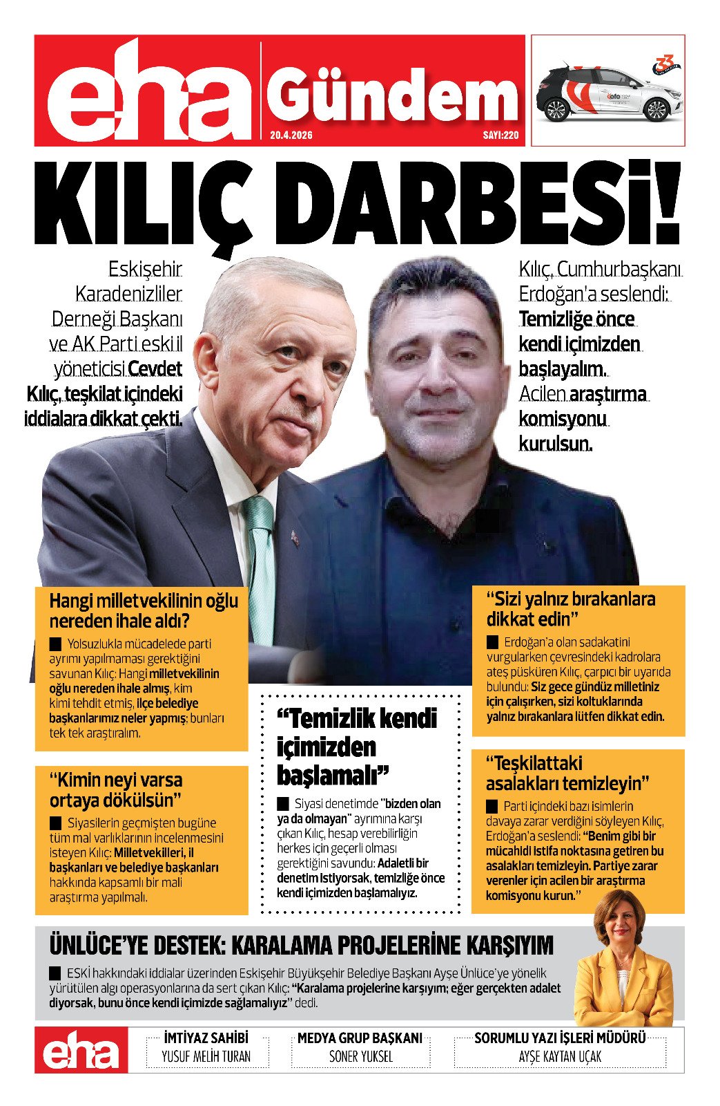 ESKİ hakkındaki iddialar üzerinden Eskişehir Büyükşehir Belediye Başkanı Ayşe Ünlüce’yeyönelik yürütülen algı operasyonlarına da sert çıkan Kılıç: "Karalama projelerine karşıyım; eğer gerçekten adalet diyorsak, bunu önce kendi içimizde sağlamalıyız" dedi.