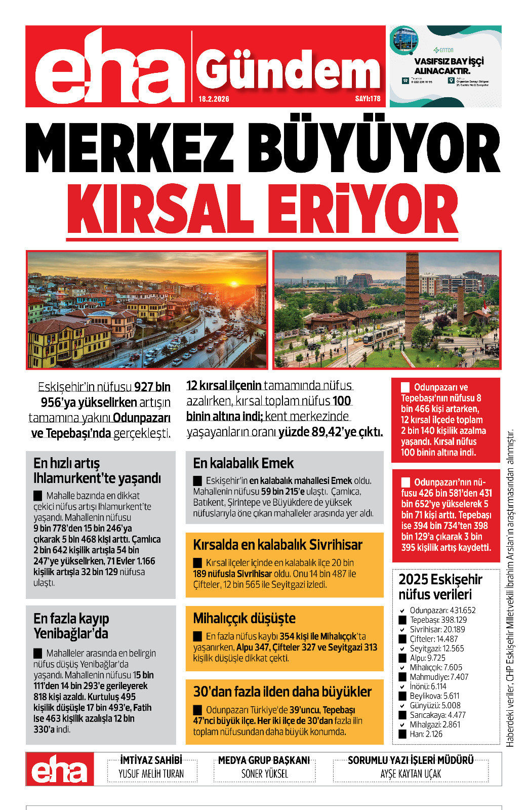 Odunpazarı ve Tepebaşı’nın nüfusu 8 bin 466 kişi artarken, 12 kırsal ilçede toplam 2 bin 140 kişilik azalma yaşandı. Kırsal nüfus 100 binin altına indi.