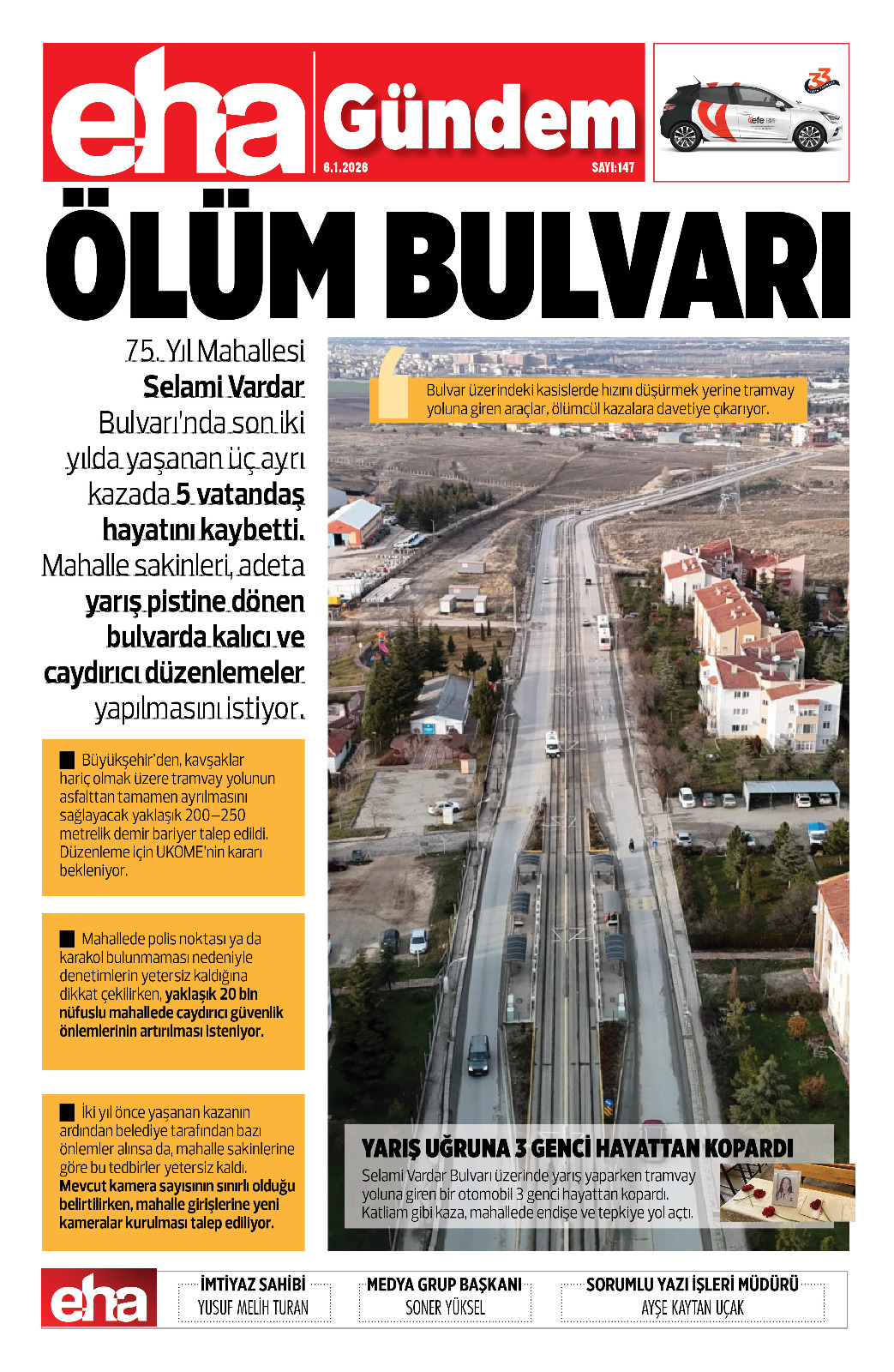 Selami Vardar Bulvarı üzerinde yarış yaparken tramvay yoluna giren bir otomobil 3 genci hayattan kopardı. Katliam gibi kaza, mahallede endişe ve tepkiye yol açtı.