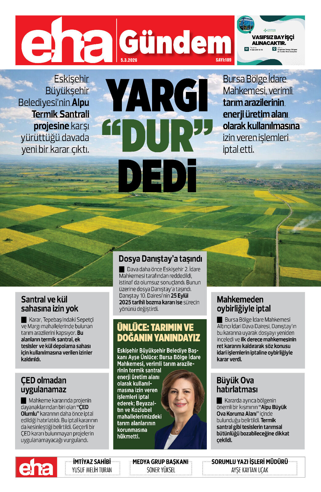 Eskişehir Büyükşehir Belediye Başkanı Ayşe Ünlüce: Bursa Bölge İdare Mahkemesi, verimli tarım arazilerinin termik santral enerji üretim alanı olarak kullanılmasına izin veren işlemleri iptal ederek; Beyazaltın ve Kozlubel mahallelerimizdeki tarım alanlarının korunmasına hükmetti.