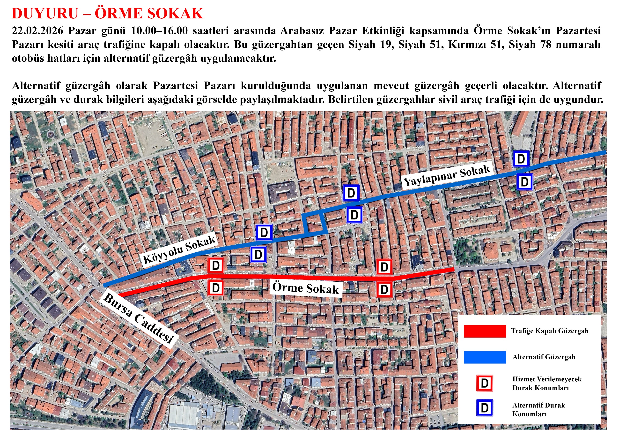 Etkinlik süresince alternatif ulaşım güzergâhları planlanırken, acil durumlar, engelli bireylerin ulaşımı ve zorunlu hizmetlerin aksamaması için belediye ekiplerinin sahada görev yapacağı bildirildi. “Arabasız Pazar” uygulaması her ayın son Pazar günü düzenli olarak gerçekleştirilmeye devam edecek.