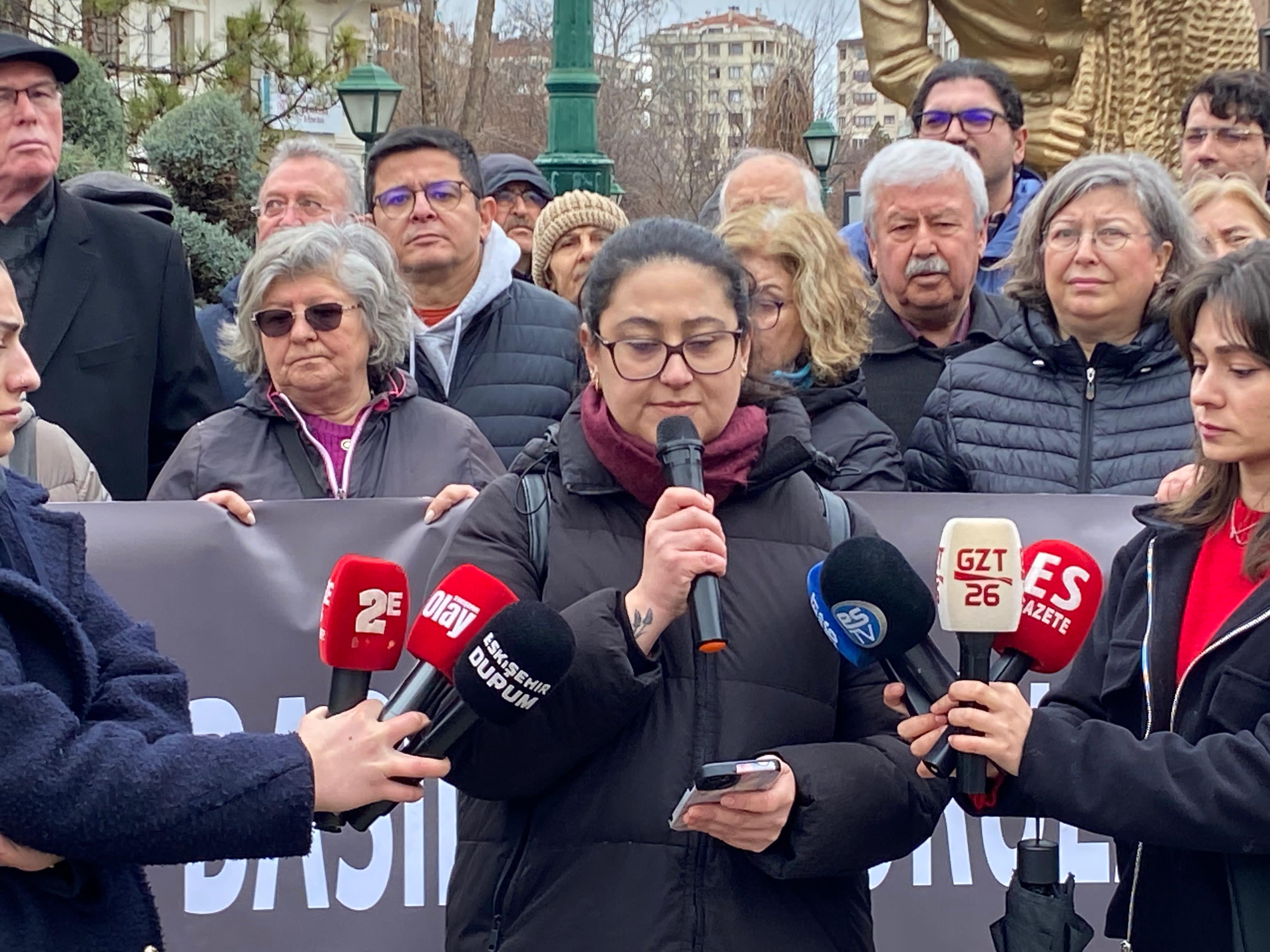 Basın açıklamasında ilk olarak ÇGD Eskişehir adına konuşan Yönetim Kurulu Üyesi Eylem Lodos, gazeteciliğin kamusal sorumluluğuna ve ifade özgürlüğüne vurgu yaptı. Lodos açıklamasında şu ifadeleri kullandı: