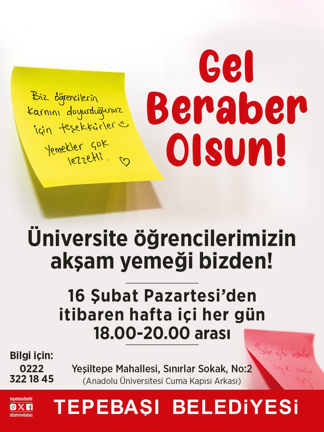 Ücretsiz akşam yemeği hizmeti, hafta içi her gün 18.00-20.00 saatleri arasında verilecek. Uygulama, Yeşiltepe Mahallesi Sınırlar Sokak No: 2 adresinde, Anadolu Üniversitesi Cuma Kapısı arkasında gerçekleştirilecek.