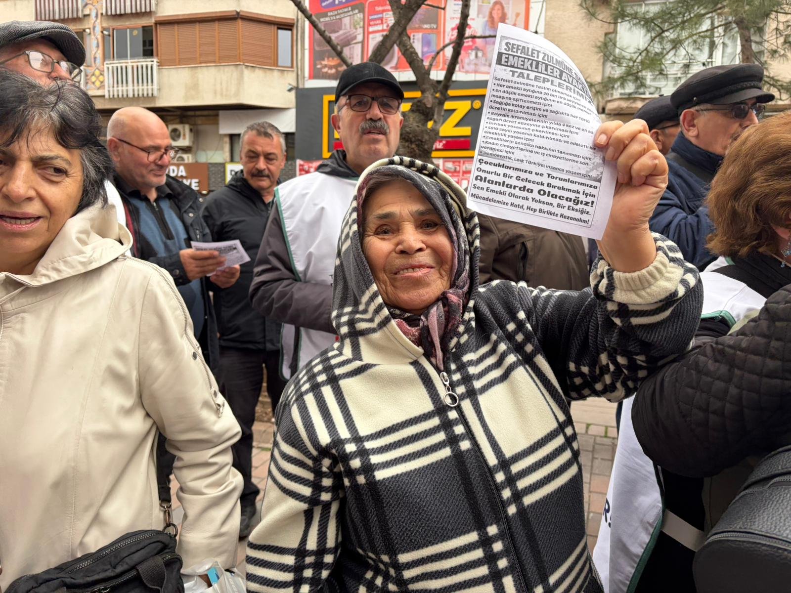 Eken, emekli maaşına acilen zam yapılması gerektiğini vurgulayarak, “Emekliler ayakta. Sefalet zulmüne teslim olmamak için taleplerimiz nettir. Her emekli aylığına 20 bin lira seyyanen zam yapılmalıdır. En düşük emekli aylığı, en düşük memur maaşına eşitlenmelidir. Sağlığa erişim kolaylaştırılmalı, sağlıkta alınan tüm ücretler kaldırılmalıdır. Bayram ikramiyeleri yılda dört kez verilmeli ve asgari ücret düzeyine çıkarılmalıdır. İntibak yasası derhâl çıkarılmalıdır. 5510 sayılı yasa kaldırılmalı, yerine adaletli bir emeklilik sistemi kurulmalıdır. Emeklilere sendika hakkı tanınmalıdır. Kadın cinayetlerine ve iş cinayetlerine son verilmelidir. Demokratik ve laik bir Türkiye’de insanca yaşam sağlanmalıdır” ifadelerini kullandı.