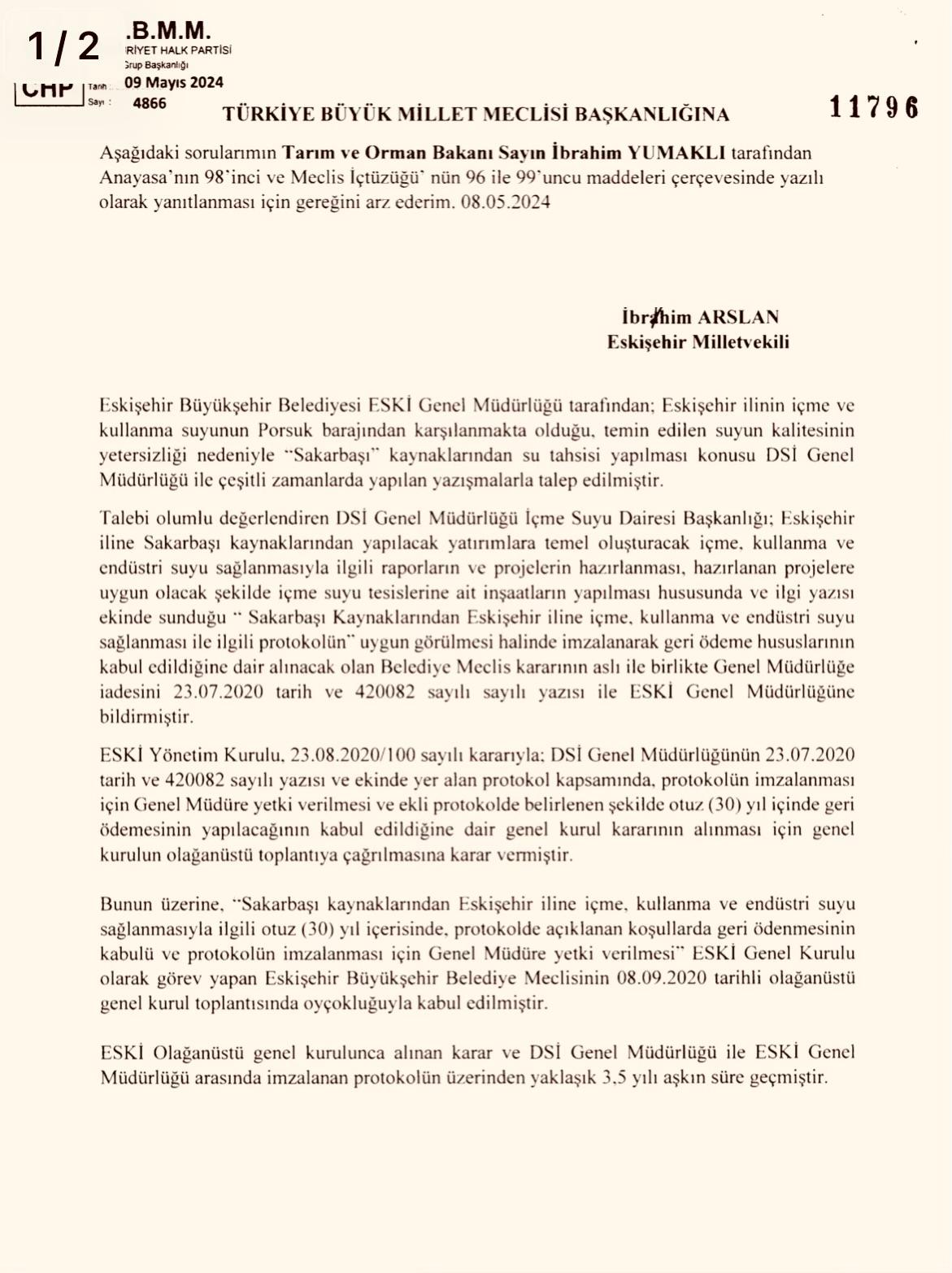 CHP Eskişehir Milletvekili İbrahim Arslan, her iki yazılı soru önergesi ile Tarım ve Orman Bakanlığı tarafından verilen yanıtları basın ve kamuoyunun incelemesine sundu. Arslan, sürecin Eskişehir’in su güvenliği açısından ciddi riskler barındırdığına dikkat çekti.