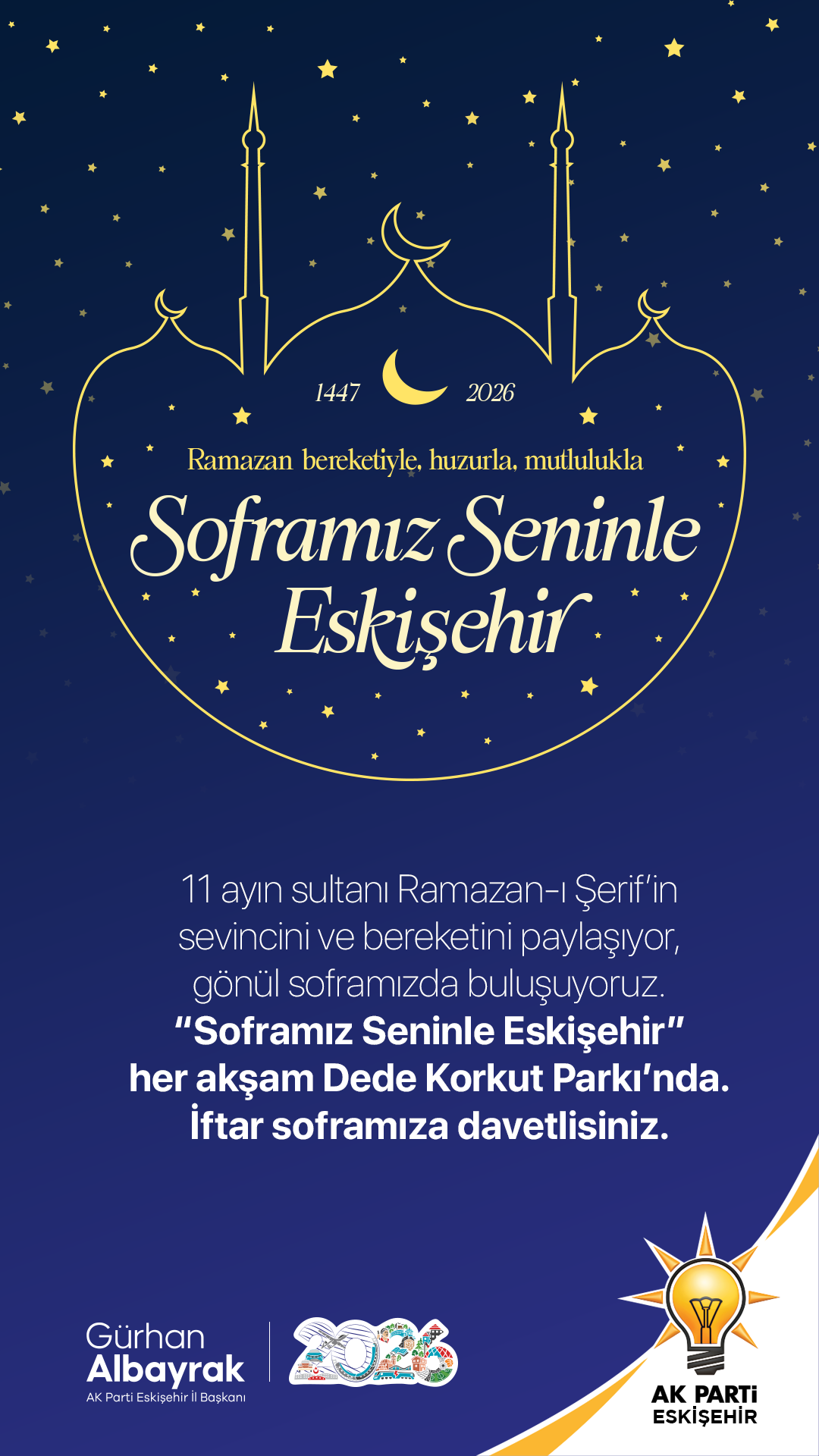 AK Parti Eskişehir İl Başkanlığı, 11 ayın sultanı Ramazan-ı Şerif’in manevi atmosferini kentin merkezine taşımak amacıyla anlamlı bir organizasyona imza attı. Program kapsamında, Ramazan ayı boyunca Dede Korkut Parkı’nda kurulan iftar çadırında vatandaşlara ücretsiz iftar verilecek.