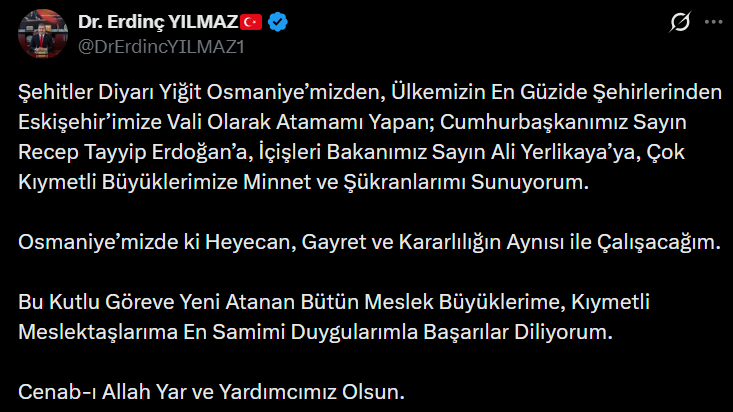 “Şehitler Diyarı Yiğit Osmaniye’mizden, Ülkemizin En Güzide Şehirlerinden Eskişehir’imize Vali Olarak Atamamı Yapan; Cumhurbaşkanımız Sayın Recep Tayyip Erdoğan’a, İçişleri Bakanımız Sayın Ali Yerlikaya’ya, Çok Kıymetli Büyüklerimize Minnet ve Şükranlarımı Sunuyorum. Osmaniye’mizde ki Heyecan, Gayret ve Kararlılığın Aynısı ile Çalışacağım. Bu Kutlu Göreve Yeni Atanan Bütün Meslek Büyüklerime, Kıymetli Meslektaşlarıma En Samimi Duygularımla Başarılar Diliyorum. Cenab-ı Allah Yar ve Yardımcımız Olsun.”