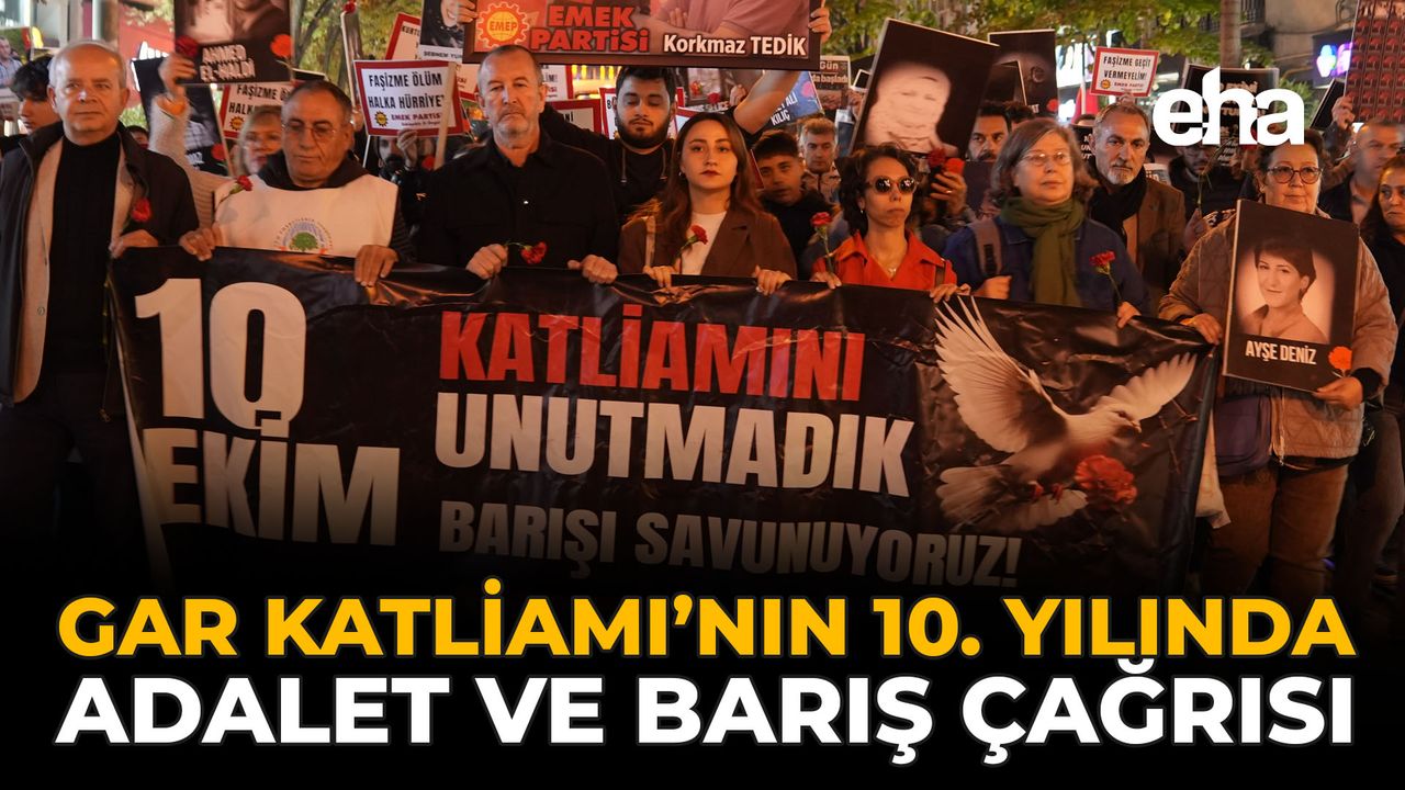 Eskişehir’de 10 Ekim Gar Katliamı’nın 10. yıl dönümünde anma töreni düzenlendi. Kamu Emekçileri Sendikaları Konfederasyonu (KESK), Devrimci İşçi Konfederasyonu (DİSK), Türk Mühendis ve Mimar Odaları Birliği (TMMOB) ve Eskişehir-Bilecik Tabipler Odası (EBTO) öncülüğünde gerçekleştirilen anma, Taşbaşı Çarşısı’nda toplanan yurttaşların oluşturduğu kortejin sloganlar eşliğinde Ulus Anıtı’na yürüyüşüyle başladı. Yürüyüşte, Gar Katliamı’nda yaşamını yitiren 104 kişinin isimlerinin yer aldığı el örgüsü “10 Ekim Özgürlük Battaniyesi” ile hayatını kaybedenlerin fotoğraflarının bulunduğu pankartlar taşındı. Yürüyüş boyunca “Barış hemen şimdi”, “Kurtuluş yok tek başına, ya hep beraber ya hiçbirimiz”, “Yaşasın halkların kardeşliği” sloganları atıldı. Anmada Filistin’de süren saldırılar da unutulmadı ve “Nehirden denize özgür Filistin” sloganı atıldı.