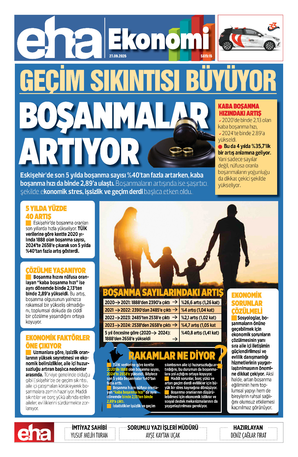 Eskişehir’de boşanma oranları son yıllarda hızla yükseliyor. TÜİK verilerine göre kentte 2020 yılında 1888 olan boşanma sayısı, 2024’te 2658’e çıkarak son 5 yılda %40’tan fazla artış gösterdi.
