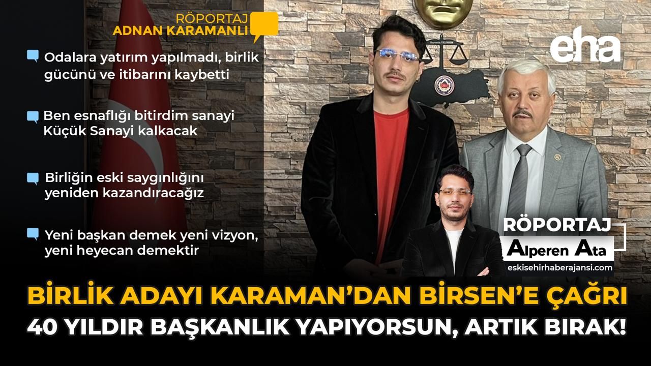 Adnan Karamanlı, rakibi Ekrem Birsen’in artık başkanlığı bırakması gerektiğini belirterek, “20 yıldır bu görevde ve artık yoruldu. Daha önce Eskişehir Kahveciler Odası Başkanlığı da yaptı. Toplamda 39 yıldır başkanlık yapıyor, artık bırakması gerekiyor. Yeni başkan demek, yeni vizyon ve yeni heyecan demektir” dedi.