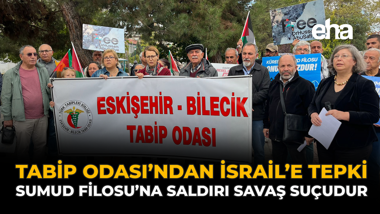 Eskişehir-Bilecik Tabip Odası, İsrail'in Küresel Sumud Filosu’na yönelik saldırısını protesto etti. Eskişehir-Bilecik Tabip Odası Yönetim Kurulu Başkanı Nazan Aksaray, Ulus Anıtı önünde yaptığı açıklamada, 7 Ekim 2023’ten bu yana İsral’in Gazze’de soykırım yaptığını, 66 bin insanın öldürüldüğünü, 170 bin kişinin yaralandığını 2 milyon insanın ise göçe zorlandığını söyledi.