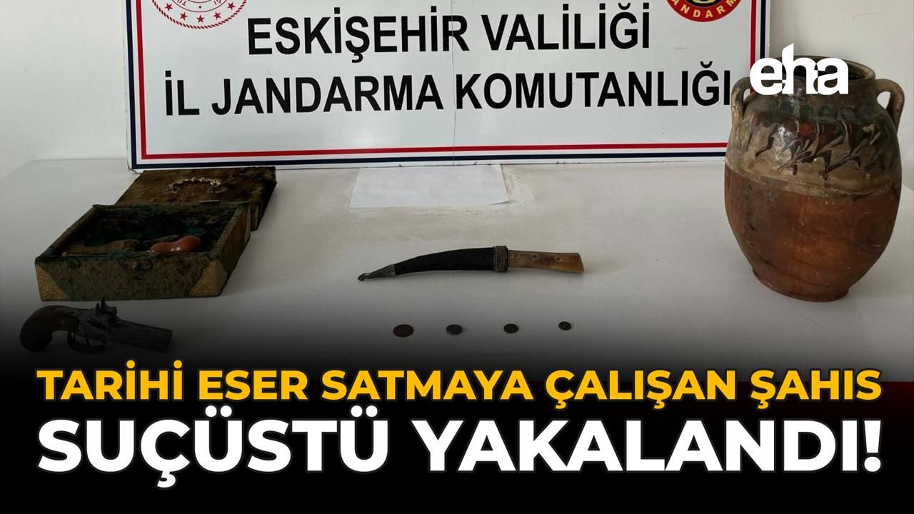 Eskişehir İl Jandarma Komutanlığına bağlı birimler tarafından yapılan çalışmalar neticesinde; Tepebaşı ilçesinde şüpheli bir şahsın tarihi eser olduğu değerlendirilen malzemeleri satmak için müşteri aradığı bilgisi alındı. Şüpheli şahıs Tepebaşı ilçesinde icra edilen operasyonla yakalanırken, yanında bulunan çantada yapılan aramada 1 ağızdan dolma kara barut tabanca, 4 bronz sikke, 1 vazo ve 1 kama ele geçirildi. Şüpheli şahıs hakkında soruşturma başlatılarak adli kontrol tedbiri uygulandı.